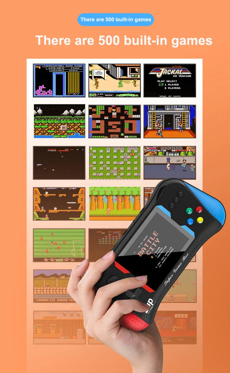 - [500 لعبة كلاسيكية مدمجة] تحتوي وحدة التحكم في الألعاب المحمولة هذه على 500 لعبة كلاسيكية مدمجة، بما في ذلك المغامرة والسباق والرماية والعمل وأنواع أخرى من الألعاب، فهي لا تجلب وقت لعب ممتع للأطفال فحسب، بل تستحضر أيضًا ذكريات الطفولة الجيدة للبالغين، وتطلق ضغوط الحياة.